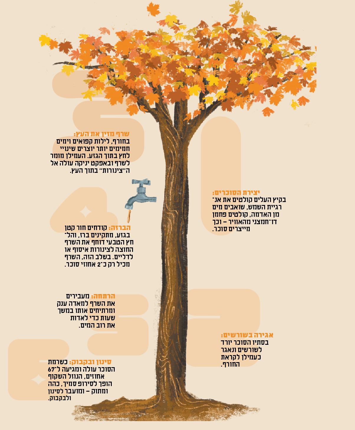 חודשים לאחר מכן, כשהחורף מתחיל לשחרר את אחיזתו ביער, הסוכר משתחרר לבסוף אל ה"עצה" של העץ - הצינורות המובילים מים וחומרי הזנה לאורך העץ. לילות קפואים גורמים ללחץ בתוך העצים לרדת, וליצור אפקט יניקה המושך מים מהשורשים. טמפרטורות יום של 4־10 מעלות צלזיוס גורמות ללחץ לעלות שוב, ודוחפות את השרף כלפי מטה. ניקוב העץ והתקנת ברז בתוכו מספיקה כדי שהלחץ הפנימי הזה פשוט ידחוף את השרף החוצה דרך החור.