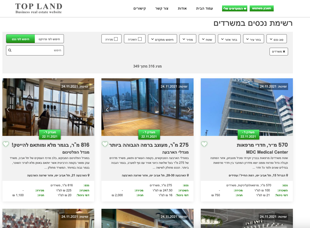 העיר תל אביב נחשבת לעיר היקרה ביותר במדינה מבחינת נדל”ן ולכן גם השכרת משרדים בעיר היא לא מהזולות. אם אתם מחפשים משרדים להשכרה בתל אביב במחירים משתלמים, הדרך הכי טובה לעשות זאת היא להתייעץ איתנו. אצלנו בטופ לנד נמצאים מומחי הנדל”ן המסחרי באזור. יחד עם המומחים שלנו שמכירים היטב את ממוצע השכירויות למשרדים בתל אביב ועל פי התנאים שתגדירו לנו, נוכל להתאים לכם משרדים בעלויות משתלמות ביחס לאזור. אנו עוזרים לעסקים רבים לרכוש משרדים לצורך השקעה ולכן יש לנו הכרות טובה עם ההצעות שקיימות בשוק.