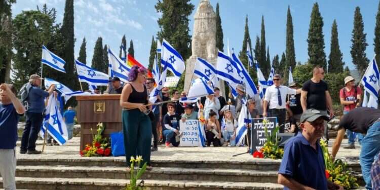 המפגינים התפזרו בין הקברים, הניפו דגלי ישראל ודגלי להט"ב, קראו קריאות נגד הכיבוש והניפו שלטים בהם נכתב "גיבורי תל חי מתהפכים בקברם", "ממשלת חורבן בית שלישי", ו"שאגת הדמוקרטיה". נשיא המדינה, שהיה אמור להשתתף באזכרה הממלכתית, ביטל את השתתפותו.
