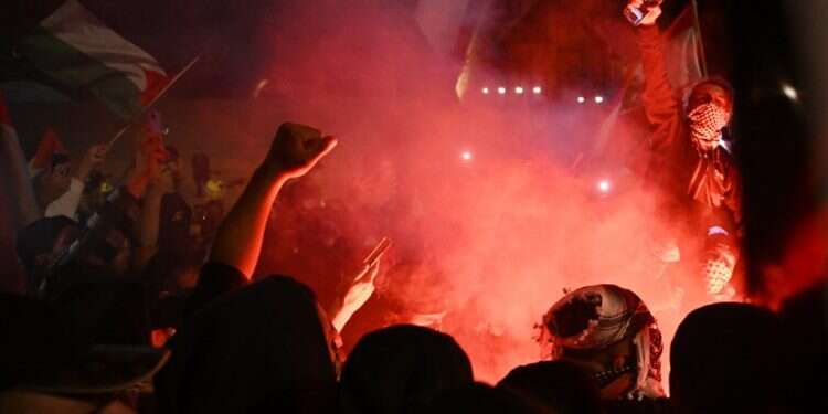 במהלך ההפגנה, עשרות חגגו את מעשי הטרור הנתעבים של חמאס כפעולות של "אומץ" ו"התנגדות" וקראו "להמית את היהודים בגז". המשטרה מנעה מיהודים להתכנס ליד בית האופרה מתוך דאגה לשלומם במקום הייתה אוירה של כאוס כאשר המפגינים, חלקם רעולי פנים, השליכו אבוקות דולקות לעברם של כמאה שוטרים שמנעו מהם אותם מלהתקרב לבניין האייקוני. מפגינים אחרים הבעירו את דגל ישראל וקרעו אותו לגזרים.