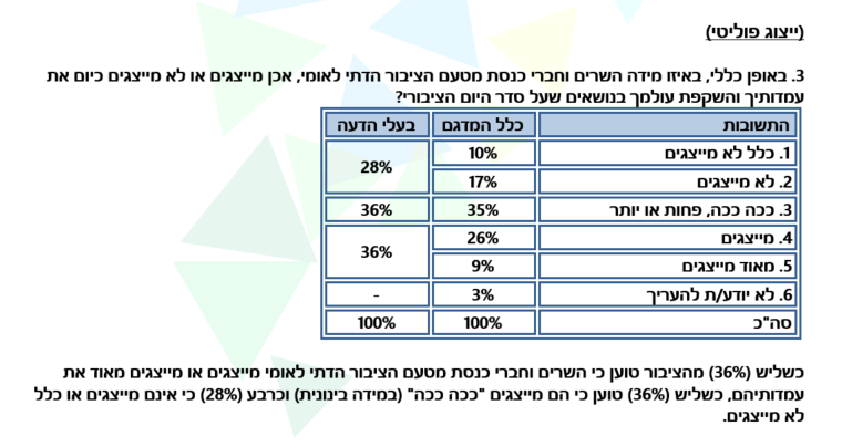 על פי ממצאי הסקר שנערך עבור עלון השבת "דרכי נועם" על ידי מכון "מאגר מוחות" בניהולו של פרופ' יצחק כ"ץ, כשליש (36%) מהציבור טוען כי השרים וחברי כנסת מטעם הציבור הדתי לאומי מייצגים או מייצגים מאוד את עמדותיהם, כשליש (36%) טוען כי הם מייצגים "ככה ככה" (במידה בינונית) וכרבע (28%) כי אינם מייצגים או כלל לא מייצגים. לגבי תפקודם בפועל של נציגי המפלגות – למעלה משליש (39%) מעניק ציון טוב או טוב מאוד לתפקודם של השרים וחברי הכנסת מטעם הציבור הדתי לאומי כיום, כשליש (34%) ציון בינוני וכרבע (27%) ציון גרוע או גרוע מאוד.
