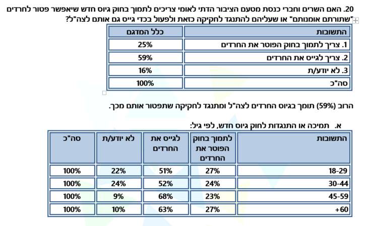 הרוב (59%) תומך בגיוס החרדים לצה"ל ומתנגד לחקיקה שתפטור אותם מכך13. הרוב (59%) תומך בגיוס החרדים לצה"ל ומתנגד לחקיקה שתפטור אותם מכך.