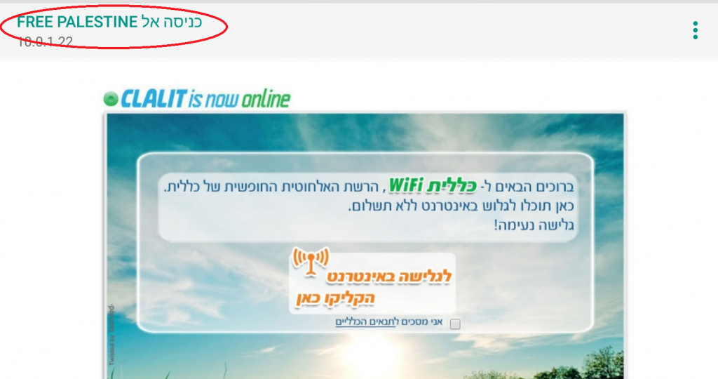 קופת חולים כללית המרכזית שבעיר נצרת, הממוקמת ב'מגדלי נצרת', מציעה שירותי תקשורת אלחוטיים מתקדמים ללא תשלום לרווחת אלפי הפונים בכל יום לשירותי המרפאה. בשבועות האחרונים הופתעו חלק מהם לגלות כי שם החיבור לרשת האינטרנט האלחוטית במקום נושא את הכיתוב באנגליתFREE PALESTINE (לשחרר את פלסטין, י"ק).