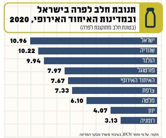 אם תשאלו כל עסקן חקלאות, הוא יספק לכם שלל סיבות אובייקטיביות־לכאורה לפער במחיר: אנחנו מדינת אי, המזון לפרות יקר כאן פי 1.3 מבאירופה, האקלים החם מפחית את תנובת החלב, יש צורך לשמור על רפתות קטנות ולא רווחיות בגבולות הביטחוניים, ועלינו לשמור על "הביטחון התזונתי". אלא שהנתונים האובייקטיביים הם שתנובת החלב של הפרה הישראלית נמצאת במקום שני בעולם (אחרי דנמרק), 43% יותר מהפרה האירופית הממוצעת. גם הרפת הממוצעת בישראל גדולה פי 9(!) מהממוצע ביבשת. משק החלב שלנו יעיל טכנולוגית ובעל יתרון לגודל, אז למה זה לא בא לידי ביטוי במחיר?