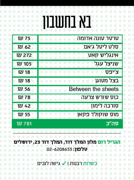 ארוחה כה בשרית מתבקש ללוות ביין אדום, וכאן הסומלייה המליץ על יין שורש של יקב צרעה. הוא היה עמוק ומצוין, החליק בקלות עם סיומת פירותית נעימה. דגמנו גם את קוקטייל הבית בעל השם המסקרן "Between the Sheets". מתברר שהעדות המתועדת הראשונה של הקוקטייל הקלאסי הזה, שנוצר במלון המלך דוד, מצויה בספרו של צ'רלס ה' בייקר משנת 1929. הוא מורכב מקוניאק, קוואנטרו, בקרדי, לימון וסוכר קנים (קנו אותי בסוכר קנים). הקוקטייל הורכב במיומנות עם איזון מאופק בין חמוץ למתוק ועם עיטור של קליפת תפוז מגולגלת שהוסיפה לכל לגימה ארומה הדרית מרירה.