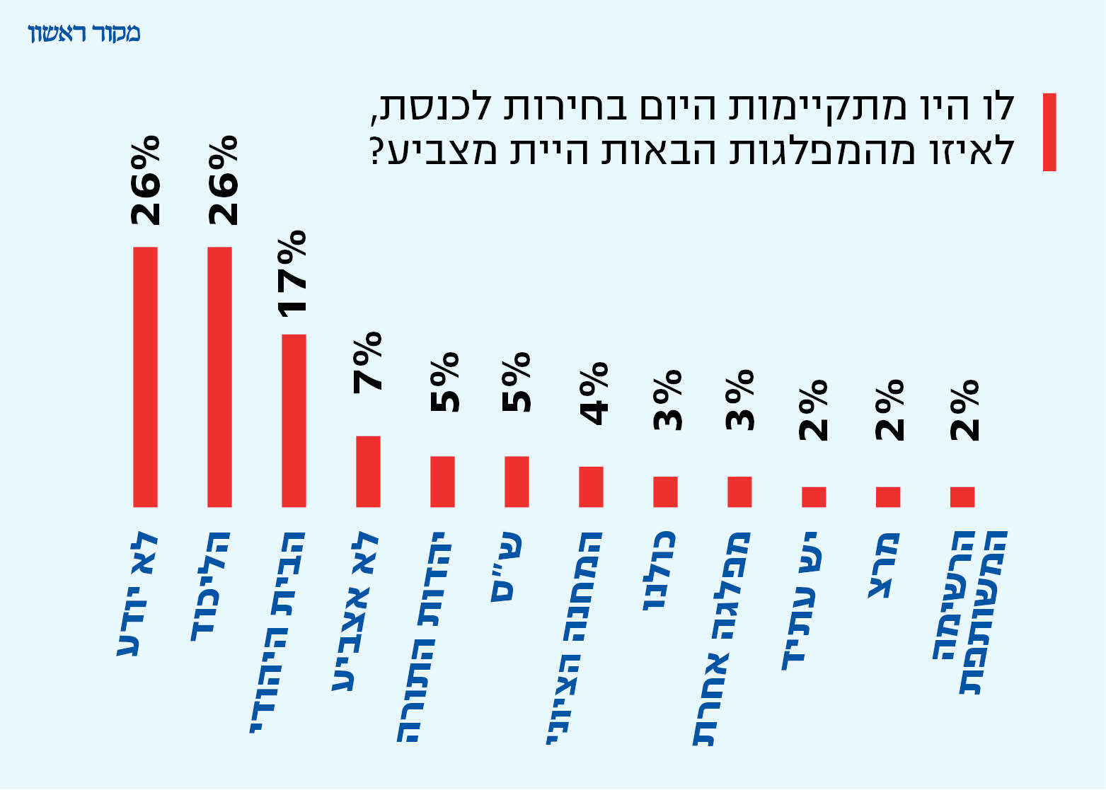 מהסקר עלה כי רבים מעולי צרפת בישראל, במיוחד החדשים שבהם, לא מתמצאים מספיק בעולם הפוליטי-ישראלי, ועל כן לא גיבשו עמדה מגובשת בנושא. עם זאת, אם הבחירות היו נערכות היום, 26 אחוזים מעולי צרפת היו מצביעים לליכוד (ראוי לציין כי הסקר התקיים לפני פרסום הממצאים האחרונות בפרשיות הקשורות לראש הממשלה נתניהו), אך אותו השיעור – 26% - אינם יודעים למי היו מצביעים. הבית היהודי במקום השני עם 17 אחוזים ושאר המפלגות קיבלו תמיכה של אחוזים בודדים: יהדות התורה וש"ס עם 5 אחוזים כל אחת, המחנה הציוני - ארבעה אחוזים ושאר המפלגות אף קיבלו פחות. שבעה אחוזים השיבו כי כלל לא יצביעו.