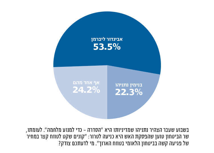 עוד בדקנו מי לדעת הציבור צודק בעמדתו - האם ראש הממשלה שאמר כי יש להגיע להסדרה כדי למנוע מלחמה, או שמא ליברמן, שקבע ביום רביעי כי הממשלה גילתה רפיסות בהפסקת האש עם חמאס. 22.3 אחוז מהאזרחים בלבד השיבו כי הם מסכימים עם עמדתו של ראש הממשלה, שעה ש־53.5 אחוזים הסכימו עם ליברמן. 24.2 אחוזים השיבו כי לא הסכימו עם אף אחד מהשניים.