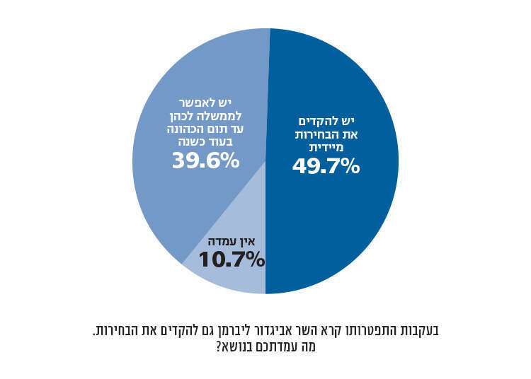 מסקר מקור ראשון שנערך השבוע לאחר התפטרותו של אביגדור ליברמן מתפקיד שר הביטחון עולה כי רוב הציבור הישראלי מעוניין בהקדמת הבחירות. הסקר נערך ביום רביעי בערב השבוע באמצעות מיזם הסקרים הדיגיטליים Direct Poll, שבבעלות שלמה פילבר וצוריאל שרון, ומלמד ש־49.7 אחוז מהציבור מסכימים עם ליברמן באשר לצורך בהקדמת הבחירות, ורק 39.6 אחוז תומכים בהשלמת ימיה של הממשלה הנוכחית. לפי התפלגות הנסקרים, גם בימין־מרכז וגם בשמאל יש רוב בעד הקדמת הבחירות.