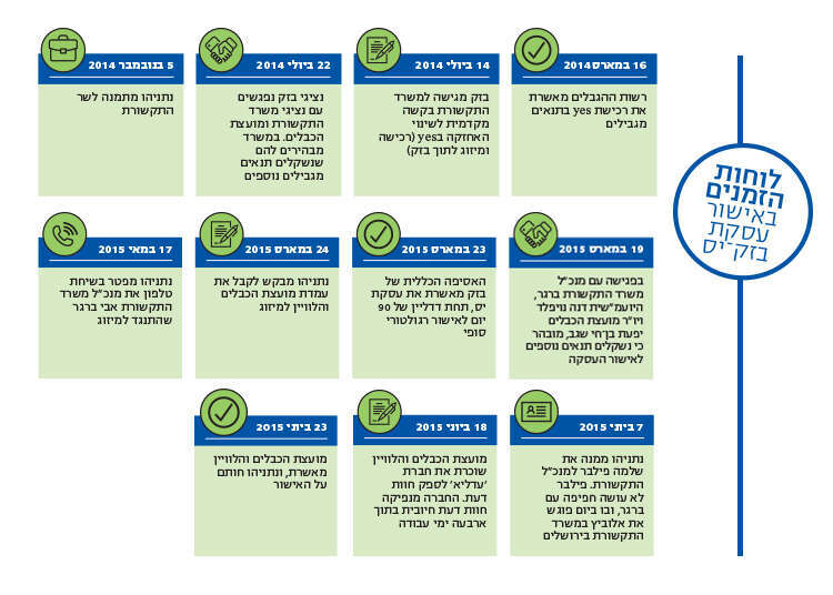 אבל כל זה היה רק הסיפתח. עסקת הענק הייתה תלויה באישורים רגולטוריים של הרשות להגבלים עסקיים ושל מועצת הכבלים והלוויין. בזק טענה שמיזוג החברות יאפשר לה למכור שירותי טלוויזיה, אינטרנט וטלפון תחת מטרייה אחת (חבילת טריפל). המדינה – המודעת לכוחה העצום של בזק בשוק הטלפוניה הקווית והאינטרנט – חששה שהמהלך יגרום לחיסול התחרות בענף. הדרג המקצועי במשרד התקשורת, בהובלת המנכ"ל דאז אבי ברגר, התנגד לאישור העסקה ללא תנאים נוספים. ברגר רצה להשתמש באישור העסקה כמנוף על בזק כדי שתיישם את רפורמת השוק הסיטונאי בתחום תשתיות התקשורת, שנועדה להגביר את התחרות ולהוריד את המחירים בתחום האינטרנט והטלפוניה. בכל זאת, במארס 2015 הצליח אלוביץ להעביר החלטה עקרונית על רכישה באסיפה הכללית של בזק, בכפוף לתנאי מרכזי אחד: שבתוך 90 יום יתקבלו כל האישורים מהרגולטור.