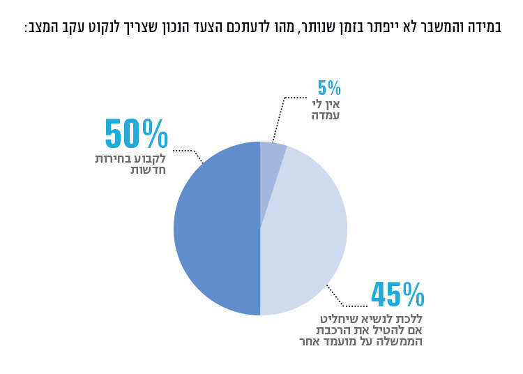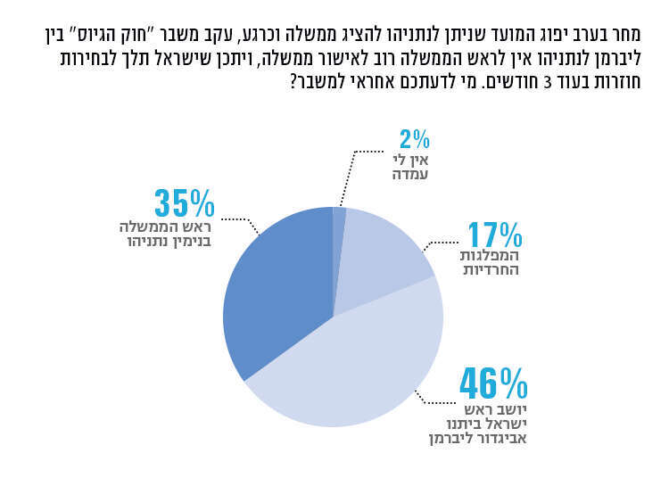 בסקר שאלנו גם מה הצעד הנכון אם משבר ליברמן וחוק הגיוס לא ייפתר. רוב הציבור - כ-50% תומכים בהליכה לבחירות חדשות, 45% בחזרה לנשיא שיחליט אם להטיל את הרכבת הממשלה על מועמד אחר ועוד חמישה אחוזים לא נקטו עמדה.