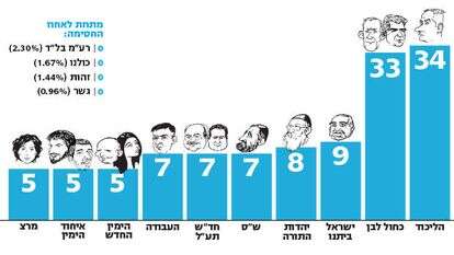 ולתמונת מצב המנדטים שעלתה בסקר: איחוד מפלגות הימין בראשות הרב פרץ וסמוטריץ' שומרת על כוחה עם חמישה מנדטים, הימין החדש הייתה עוברת הפעם את אחוז החסימה עם חמישה מנדטים, הליכוד יינזק במנדט אחד בלבד וירד ל-34 מנדטים, יהדות התורה עם שמונה מנדטים וש"ס עם שבעה (יורדת במנדט אחד). חד"ש תזכה בשבעה מנדטים ובל"ד לא תעבור הפעם את אחוז החסימה, מרצ עם חמישה מנדטים, כחול לבן יורדת בשני מנדטים ל-33 וישראל ביתנו עם תשעה מנדטים (תוספת של ארבעה). מי שלא עוברים את אחוז החסימה גם הפעם הם אורלי לוי ומפלגת זהות של משה פייגלין, ואליהם מצטרף גם כחלון, שאם לא יחבור בבחירות חדשות לליכוד - יזכה על פי הסקר בפחות משני אחוז מקולות הנסקרים.