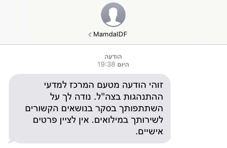 "עד כמה אתה סומך על כושר הלחימה ויכולת ההכרעה של צה"ל"? באיזו מידה את/ה בוטח/ת בהחלטותיהם ובכושר שיפוטם של המפקדים הבכירים של צה"ל? באיזו מידה את/ה נותן/ת אמון במפקדים הישירים שלך? ו"באיזו מידה את/ה מסכים/ה עם המשפט: "אם אקרא לשירות מילואים, כאשר קיים איום מוחשי של ירי טילים על מקום מגוריי אתייצב לשרות מיד". אלו רק חלק מ-34 שאלות עומק שהפיץ לאחרונה צה"ל לטלפונים הניידים של חיילי מילואים רבים במסגרת סקר אנונימי שעורכים במחלקת מחקר מדעי ההתנהגות (ממד"ה).