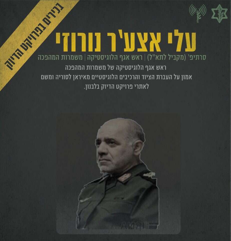 סרתי'פ (מקביל לתת-אלוף) עלי אצ'ער נורוזי: ראש אגף הלוגיסטיקה במשמרות המהפכה, אחראי על העברת ציוד ורכיבים הלוגיסטיים מאיראן לסוריה ומשם לאתר פרויקט הדיוק בלבנון.