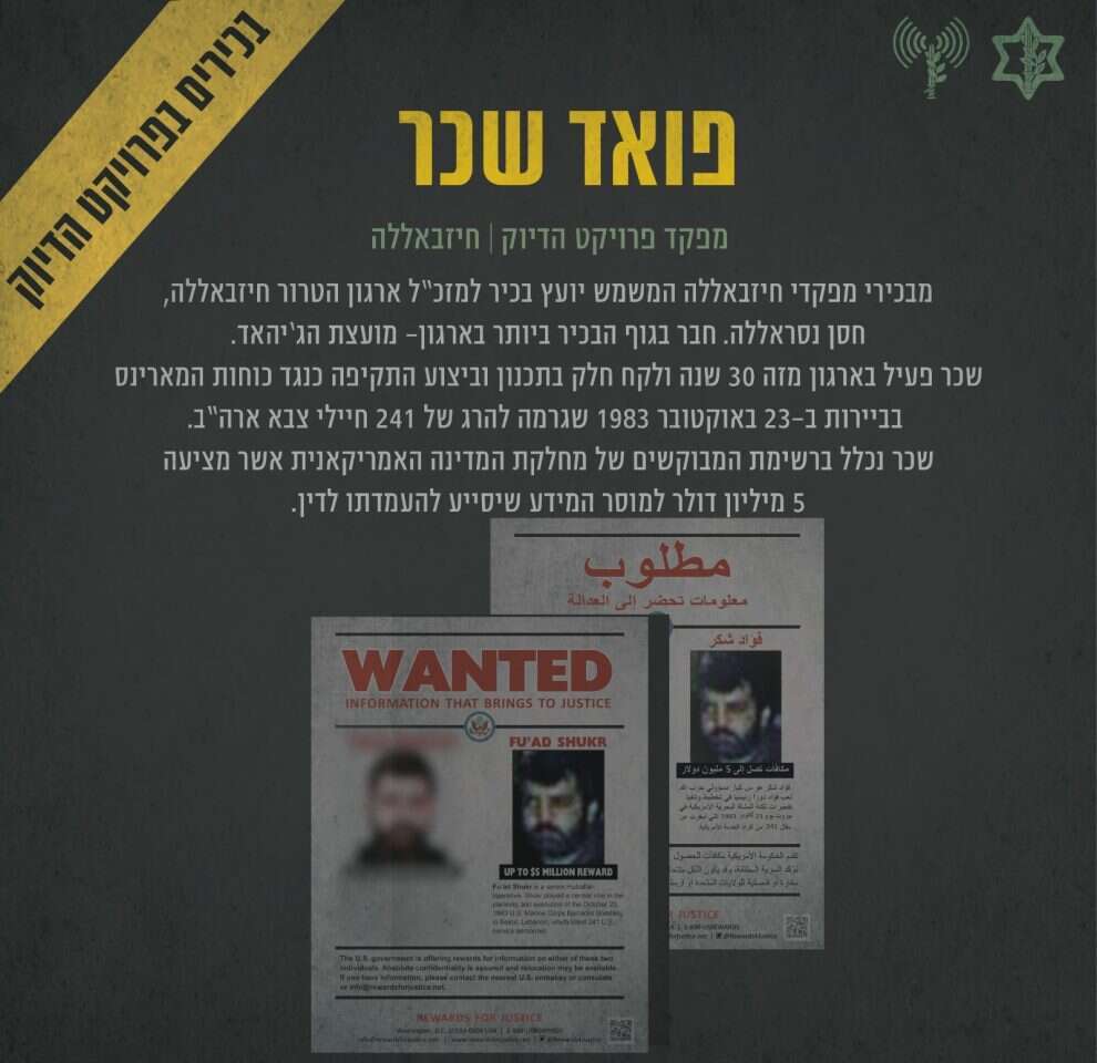 פואד שכר: מבכירי מפקדי חיזבאללה ומפקד פרויקט הדיוק מטעמם. יועץ בכיר למזכ"ל ארגון הטרור חיזבאללה, חסן נסראללה, וחבר בגוף הבכיר של הארגון - מועצת הגיהאד. שכר פעיל בארגון מזה 30 שנה ולקח חלק בתכנון וביצוע התקיפה כנגד כוחות המרינס בביירות ב-23 באוקטובר 1983 שגרמה להרג של 241 חיילי צבא ארה"ב. שכר נכלל ברשימת המבוקשים של מחלקת המדינה האמריקנית, שמציעה חמישה מיליון דולר למוסר המידע שיסייע להעמדתו לדין.