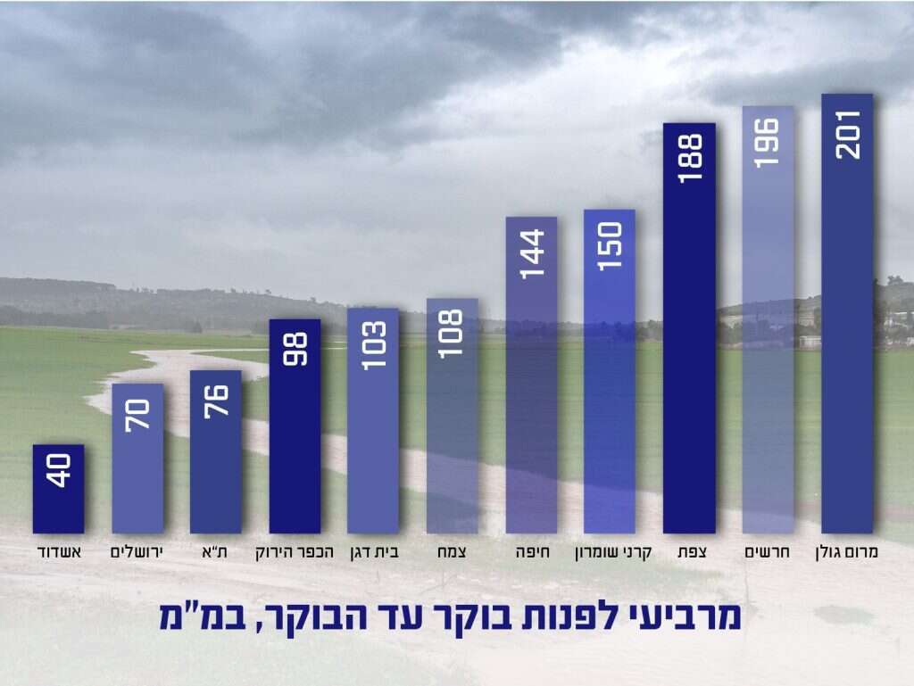 מרביעי לפנות בוקר עד הבוקר, נמדדו כמויות נאות של גשם, בעיקר בצפון. בתחנת המדידה במרום גולן ירדו 201 מ"מ, חרשים 196 מ"מ, צפת 188 מ"מ, קרני שומרון 150 מ"מ וחיפה עם 144 מ"מ של גשם. במרכז הארץ נמדדו כמויות פחותות יותר. ת"א עם 76 מ"מ, ירושלים 70 מ"מ ואשדוד 40 מ"מ של גשם.