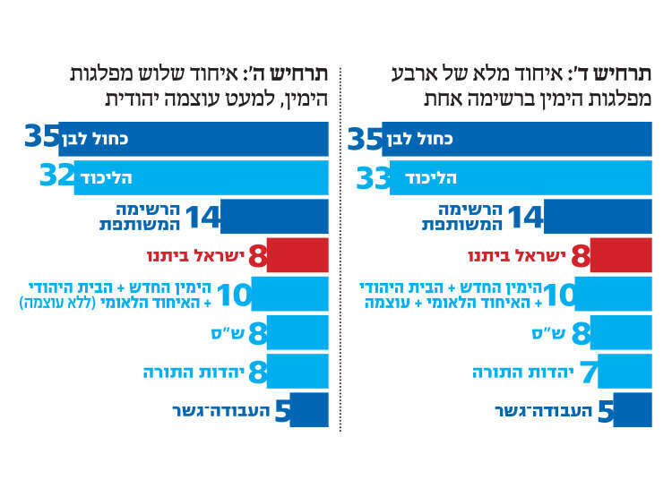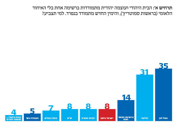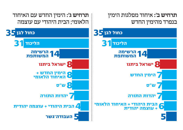 במצב הקיים, רשימת הבית היהודי ועוצמה יהודית בלי האיחוד הלאומי עומדת על סף אחוז החסימה, עם 4 מנדטים, ואילו רשימת הימין החדש עומדת על 7 מנדטים. בסך הכול השתיים מקבלות בסקר 11 מנדטים, 4 מנדטים מעל לכוחן הנוכחי, אך אין די בכך כדי שגוש הימין בלי ישראל ביתנו יגיע ל־61 מנדטים. גם בתרחישים האחרים שסקרנו, גוש הימין אינו מצליח לכבוש את ההר בלי ליברמן.