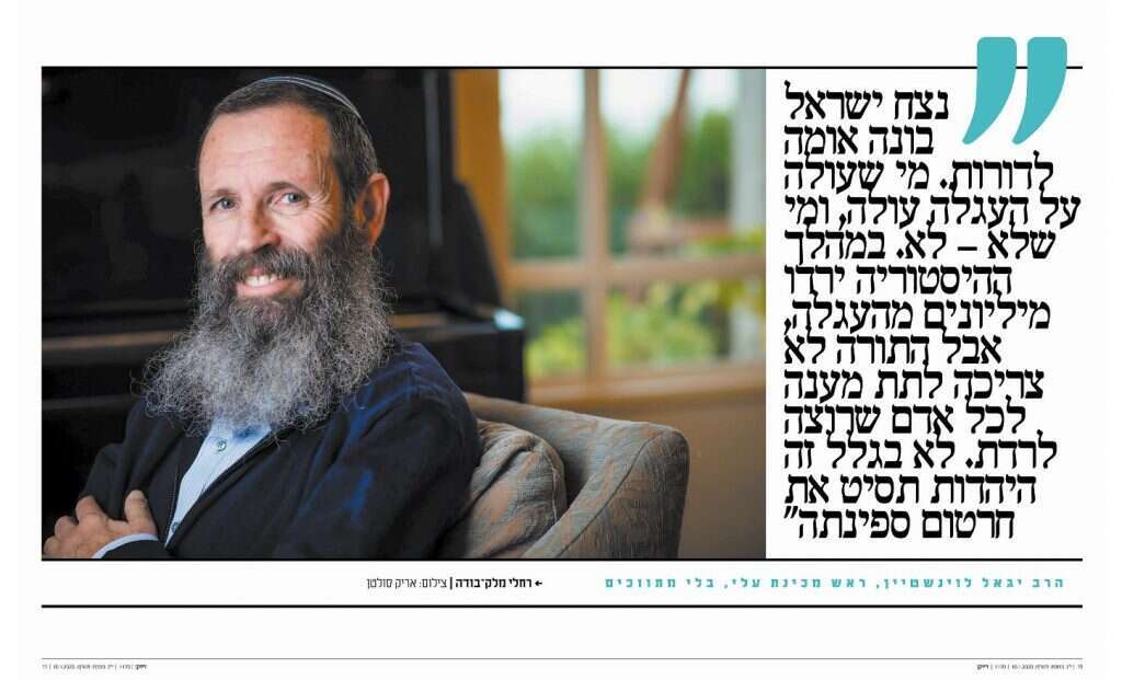 3 הריאיון של רחלי מלק־בודה עם הרב יגאל לוינשטיין, "נצח ישראל בונה אומה לדורות", שפורסם בדיוקן לפני שבועיים (10.1.2020), ממשיך לעורר הדים. במכתב למערכת ביקשה הקוראת אילה גולדברג להגיב לאמירתו של הרב לוינשטיין ש"בתוך התורה יש מסלולים וגישות, אבל כולם מחויבים לתורה ומצוות בלי יוצא מן הכלל".