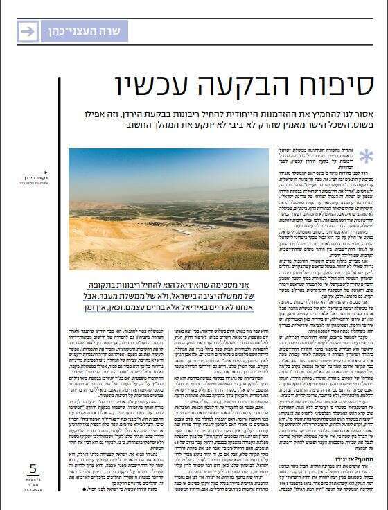 4 במאמרה "סיפוח הבקעה עכשיו", שפורסם בשבוע שעבר ביומן (17.1.2020), נימקה שרה העצני־כהן את הסיבות לקדם את המהלך הדרמטי גם בזמן פגרת הבחירות, בעוד ממשל טראמפ הפרו־ישראלי שולט בבית הלבן, ולפני שהפלסטינים יקדמו עוד מהלכים להשתלטות על שטחי C.