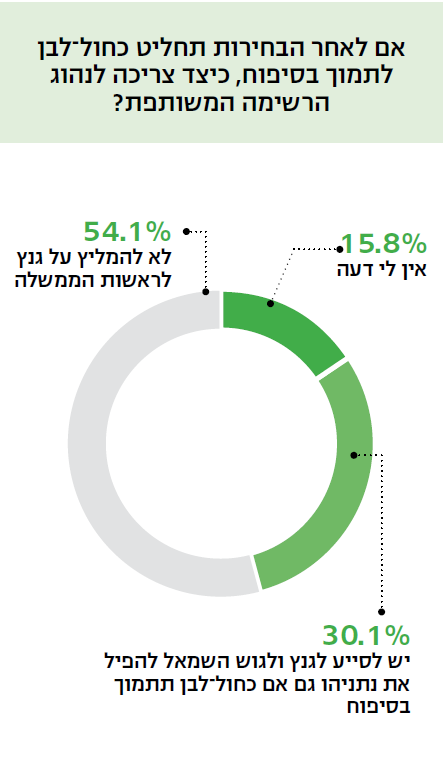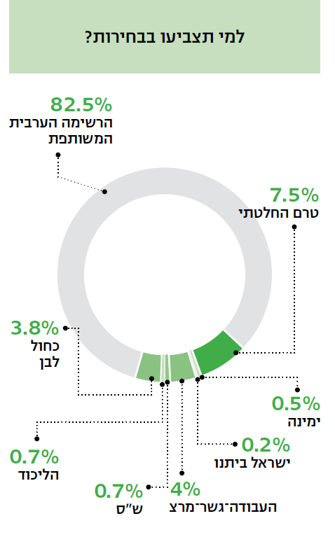 מבחינת הכוונה להגיע בפועל לקלפי, הנתונים דומים לאלה של ספטמבר. עם זאת, הרשימה המשותפת עשויה להגיע ל־14 מנדטים, בזכות תוספת של כ־25 אלף מצביעי שמאל שאיחוד מרצ עם העבודה יגרום להם להצביע למשותפת. היחס לכחול־לבן הוא בגדר כבדהו וחשדהו. מחצית מהנשאלים רואים בה בכלל מפלגת ימין, הרוב בטוחים שתתמוך בסיפוח, ובמקרה כזה חמישים אחוזים סבורים שאין להמליץ עליהם לנשיא.
