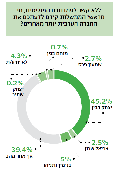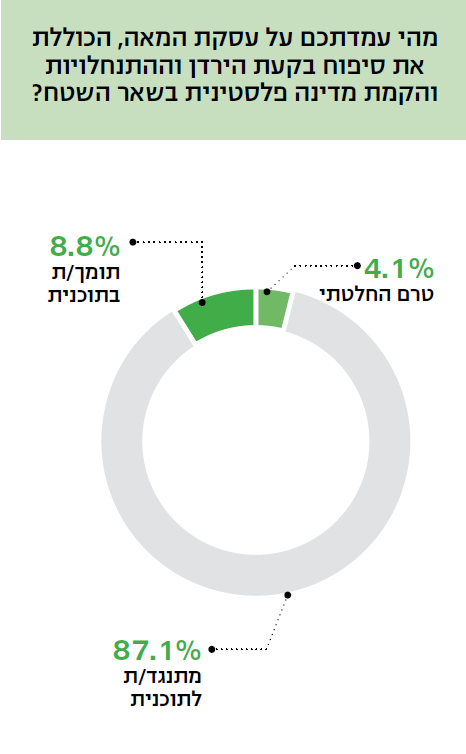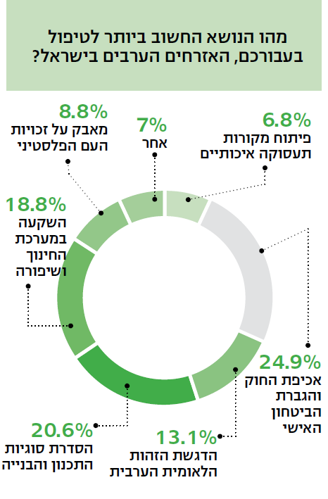 עוד עולה כי ברמה ההצהרתית הציבור הערבי מביע התנגדות לתוכנית השלום של הנשיא טראמפ, אבל אם היא תצא לפועל חשוב לו בעיקר להבטיח שלא יתבצעו חילופי שטחים ושהוא לא ימצא עצמו בשטחי המדינה הפלסטינית. כדי שזה יתרחש, מחצית מהנשאלים מוכנים לקבל את המתווה שבמסגרתו שום תושב לא ייעקר. עם זאת, בחיים עצמם הנושאים הללו נמצאים הרחק מאחור, אחרי הדרישה לאכיפת חוק, מיגור האלימות, הסדרת נושאי התכנון והבנייה ושיפור החינוך. דווקא סוגיות התעסוקה אינן מטרידות את המגזר.