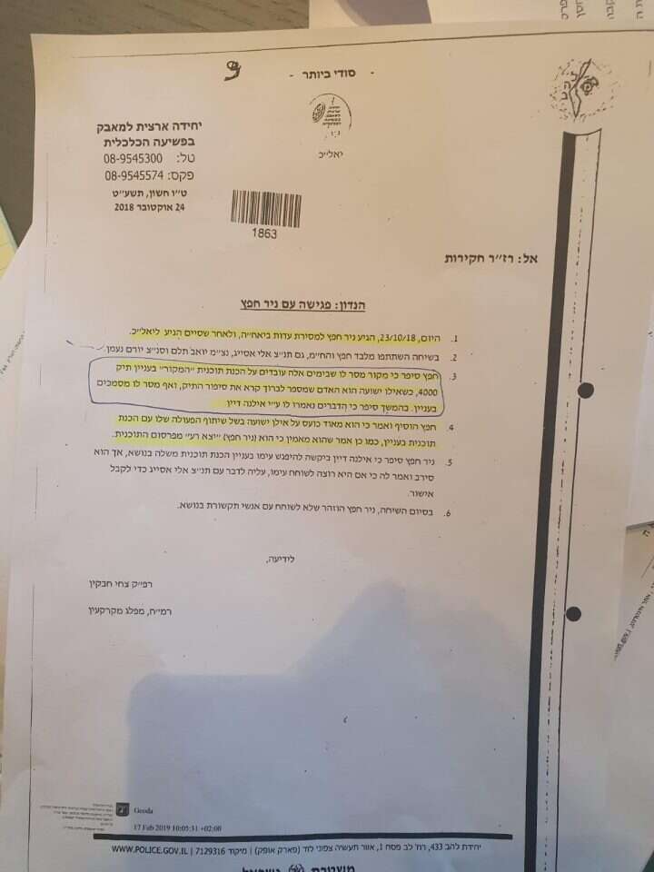 לעתירה צורף מזכר שנכתב על ידי רפ"ק צחי חבקי, רמ"ח מפלג מקרקעין ביחידה הארצית למאבק בפשיעה כלכלית, עם הכותרת "סודי ביותר", בו נרמז כי זהות מדליף חומרי החקירה הייתה ידועה כבר בשנת 2018. במזכר מתוארת פגישת חוקרים שנערכה עם ניר חפץ, עד המדינה. "חפץ סיפר, כי מקור מסר לו שבימים אלה עובדים על הכנת תכנית "המקור" בעניין תיק 4000, כשאילן ישועה הוא האדם שמספר לברוך קרא את סיפור התיק, ואף מסר לו מסמכים בעניין. בהמשך סיפר כי הדברים נאמרו לו על ידי אילנה דיין", כך נכתב.