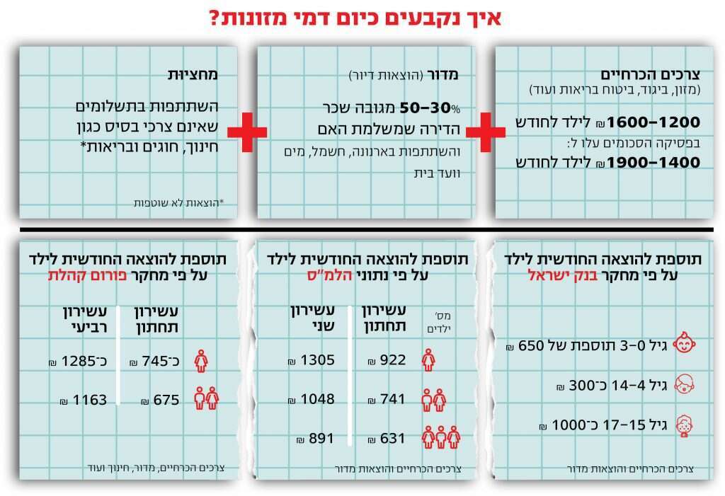 מתברר שמשפחה בעשירון הראשון, הנמוך ביותר, מוציאה באופן כללי כ־160 אחוז מהכנסותיה, ובכך נכנסת לגירעון ולחובות קבועים. ועדיין, המספרים נמוכים בהרבה מאלו של בתי המשפט. כך למשל, משפחה בעשירון הראשון עם ילד אחד מוציאה עליו 922 שקלים. אותה משפחה בעשירון השני תוציא 1,305 שקלים. משפחה עם שני ילדים בעשירון הראשון מוציאה על כל ילד 741 שקל, ובעשירון השני 1,048. משפחה עם שלושה ילדים בעשירון הראשון מוציאה 631 שקל על כל ילד, ו־891 בעשירון השני. הסכומים מעט גבוהים יותר כשמדובר בילדים גדולים בגיל תיכון.