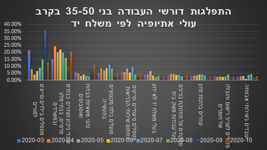 ניתן לראות שבחודש ספטמבר 35% מקרב דורשי העבודה החדשים בקרב עולי אתיופיה, היו מי שעוסקים בטיפול בילדים וסייעי הוראה, זאת לעומת למעלה מ-20% בחודש מרץ. כאשר מתבוננים במקצועות, ולא בענפי התעסוקה, ניתן לראות שלצד סייעי ההוראה מקצועות בולטים נוספים שנפגעו בקרב בני 35-50 עולי אתיופיה מאז פרוץ המשבר הם המוכרים בחנויות ועובדי הניקיון.