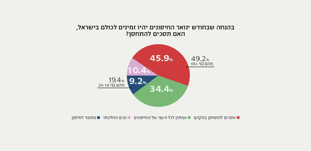 לאחר הבשורות על פיתוח חיסונים לקורונה בידי החברות פייזר, מודרנה ואסטרהזניקה, העולם כולו ממתין לייצור המוני שלהם. על פי הכרזת ראש הממשלה נתניהו, כבר בתחילת ינואר תגיע אלינו מנת החיסונים הראשונה. עם זאת, כעת מתברר כי למעלה ממחצית מאזרחי ישראל יחששו להתחסן. כך עולה מסקר שערך מכון "דיירקט פולס" בקרב מדגם מייצג של 585 משתתפים. מבין המשיבים לסקר, 34.4 אחוזים הצהירו כי יעדיפו להמתין להגעת "הגל השני" של החיסונים ורק אז יהיו מוכנים להתחסן. 19.6 אחוזים אמרו כי לא גיבשו עדיין דעה או שהם לא מתכוונים כלל להתחסן.