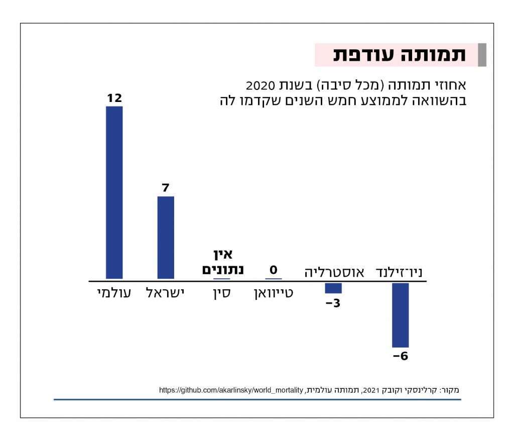 במחקר עדכני שניתח תמותה עולמית בכ־80 מדינות בעולם, הראו החוקרים אריאל קרלינסקי ודמיטרי קובאק כי התמותה העולמית כתוצאה מקורונה כנראה גבוהה מהמדווח. התמותה העולמית השנה גבוהה בכ־12 אחוזים מהממוצע של חמש השנים שלפניה, ובישראל היא גבוהה בכ־7 אחוזים (עוד לפני הנתונים של ינואר המדמם). אבל בניו־זילנד ובאוסטרליה, התמותה של שנת 2020 הייתה נמוכה מהשנים שלפניה. הסגר ומגבלות הריחוק החברתי צמצמו ככל הנראה מוות ממחלות מידבקות אחרות ומגורמים כמו תאונות דרכים ועוד. בטיוואן נתוני התמותה השנה לא היו שונים באופן מובהק מהשנים הקודמות.