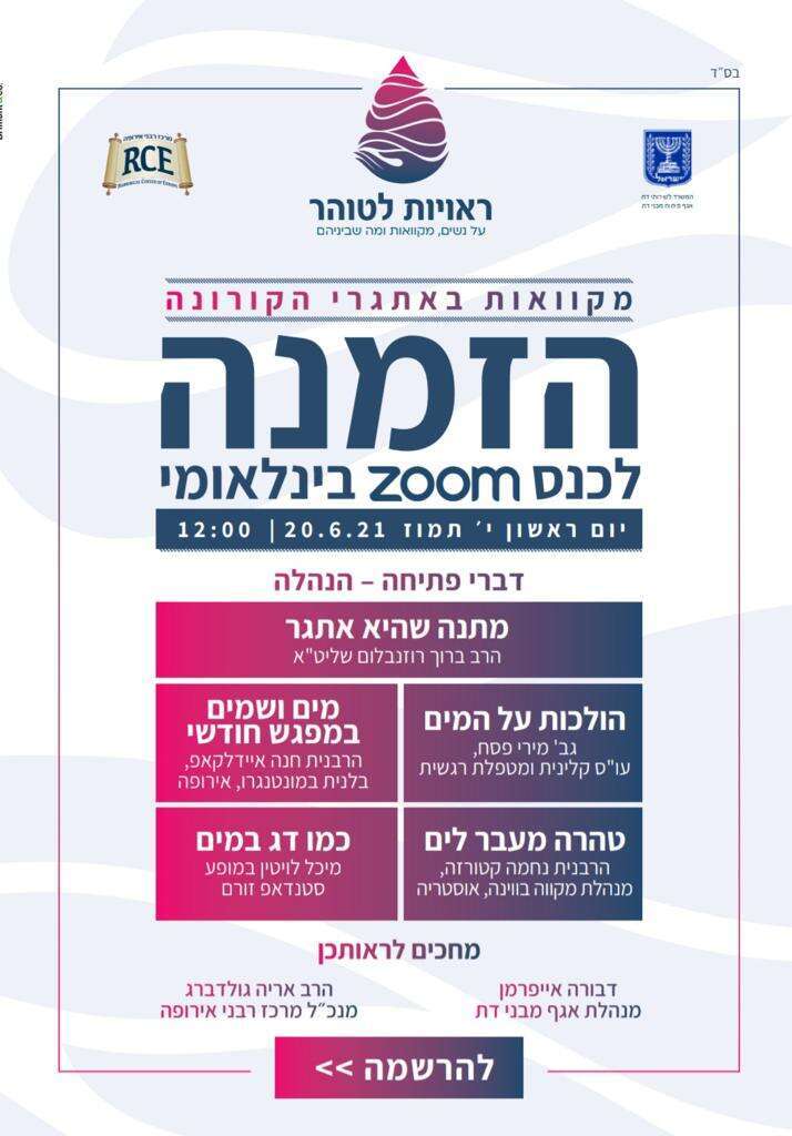 מאות נשים מישראל ומרחבי אירופה ישתתפו ביום ראשון ביום עיון בנושא "הגברת הטהרה בעם ישראל". הכנס ייערך באופן מקוון ביוזמה משותפת של המשרד לשירותי דת ו"מרכז רבני אירופה". בכנס ישתתפו נשים מישראל ומאירופה ויעסקו בו בבעיות שנוצרו בעקבות תקופת משבר נגיף הקורונה.