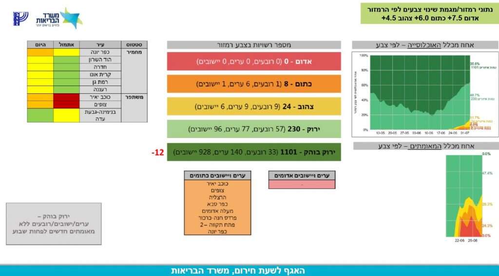 מגמה חיובית נרמה ביישובים כוכב יאיר וצופים שהפכו מאדומות לכתומות, ובבנימינה שהפכה לירוקה. לעומת זאת הוד השרון, חדרה, קריית אונו, רמת גן ורעננה הפכו היום מירוקות לצהובה. וכפר יונה הפכה מצהובה לאדומה.
