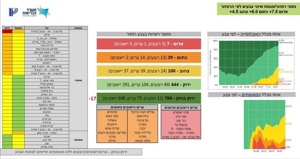 במודל הרמזור העיר תל-אביב נמצאת במגמת החמרה - רובע מזרח בעיר הפך הבוקר לאדום והצטרף לעוד שישה רשויות - קרני שומרון, שבי ציון, ניר יפה, גבעות בר, פתח תקווה ונתניה מזרח העיר. שלושה אזורים נוספים בתל-אביב הפכו לכתומים ואזור נוסף החמיר מירוק לצהוב. מספר ערים נוספות הפכו לכתומות ביניהן רחובות, מודיעין מכבים-רעות ואילת.