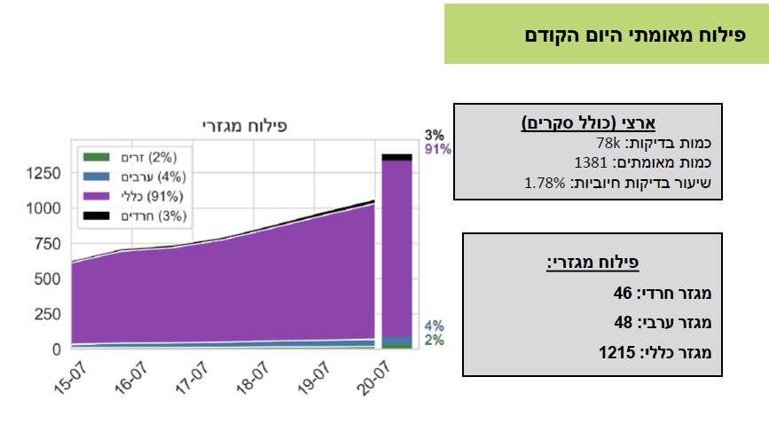 בחברה החרדית נמצא המספר הנמוך ביותר של חולים מאומתים יומיים - 46 חולים המהווים 3% מהחולים. בחברה הערבי נתונים דומים עם 48 חולים ובמגזר הכללי 1,215 חולים.