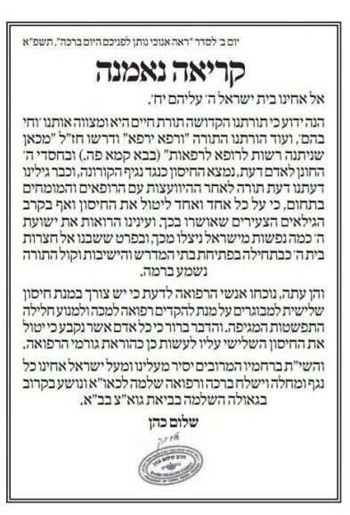 בביטאון 'הדרך', התפרסם השבוע מכתבו של חכם שלום כהן, נשיא מועצת חכמי התורה, שיצא בהוראה ברורה לקבלת החיסון השלישי. "יש צורך במנת חיסון שלישית למבוגרים על מנת להקדים רפואה למכה". כך נכתב. ראש הישיבה שב וחידד את ההוראה הכללית לקבלת החיסון, גם לבני הנוער.