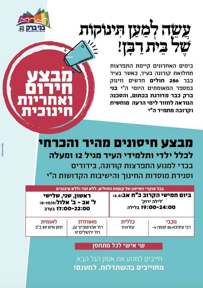 עיריית בני ברק בשיתוף כל קופות החולים בעיר הודיעה לתושביה על מבצע חיסונים לאור נתוני התחלואה. בעיר, ששמרה על שיעור תחלואה נמוך משך תקופה ארוכה, מבקשים להקדים מבצע חיסונים שישים דגש על הגיל הצעיר לקראת החזרה ללימודים. בישיבות ובמוסדות החינוך בעיר יחלו הלימודים כבר בראש חודש אלול, ביום שני הקרוב יחזרו הבנים אל הכוללים והישיבות. בנות בחינוך העצמאי וגני הילדים יחזרו בי"ז באלול, 25 לאוגוסט.