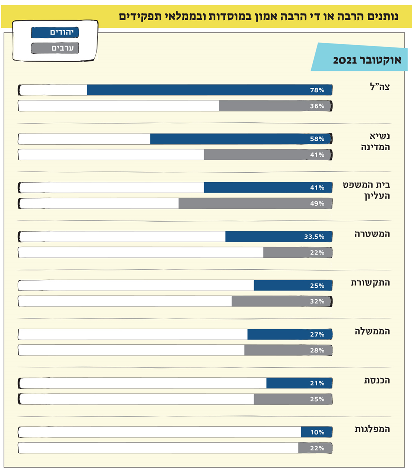 שפל חסר תקדים באמון הציבור בבית המשפט העליון. מדד הדמוקרטיה הישראלית שהגישו היום (ה') אנשי המכון הישראלי לדמוקרטיה לנשיא המדינה, מראה כי רק 41% ממשתתפי הסקר היהודים, הביעו הרבה או די הרבה אמון בבית המשפט העליון, הנתון הנמוך בותר שמדדו אנשי המכון מאז שנת 2003. עם זאת, יש לציין כי למרות הירידה המתמשכת באמון בו, בית המשפט העליון שמר על מקומו בין שלושת המוסדות השלטוניים הנהנים מרמת האמון הגבוהה ביותר, אחרי הצבא ונשיא המדינה.