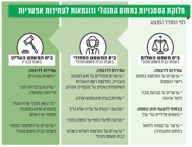 לפי דברי ההסבר לחוק, בשלום המנהלי יידונו עניינים בעלי אופי מקומי כמו רישוי עסקים, ארנונה ועיצומים כספיים (שחלקם נידונים בשלום כבר היום). "אדם שרוצה לעתור ביחס לארנונה שנפסקה לו או במקרה של ביטול רישיון עסק, ייגש לשלום המנהלי, דבר שגם ינגיש את ההליך וגם יקל על העומס במחוזי ובעליון", אומר עו"ד לימון. "יתרון נוסף הוא שאנחנו לוקחים סדרה ארוכה של נושאים שעד כה הטיפול בהם היה בסדר דין אזרחי, ומכניסים אותם לסדר דין מנהלי שניהולו פשוט ומהיר יותר. זה מהלך שמייעל את המערכת".