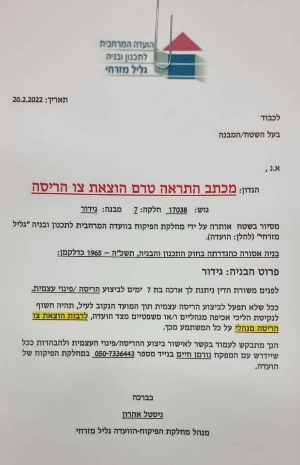 לבעלי החלקות ניתנה שבוע התראה לביצוע הריסה/פינוי עצמית ולאחר מכן תוציא הועדה צו הריסה מנהלי. ״מחובתו של כל ראש מועצה בכלל ואזורית בפרט- לשמור על השטחים הפתוחים והמרחב הכפרי", אמר היום ניצן פלג, ראש המועצה האזורית גליל תחתון שנאבק בשינוי ייעוד הקרקע במרחבי הגליל. לדבריו, "מדובר בתופעה שהיא הפרה בוטה של המרחב. במקום שדות ומטעים - פארקים מגודרים ומתחמי פנאי. לא לזה התכוון המשורר״.