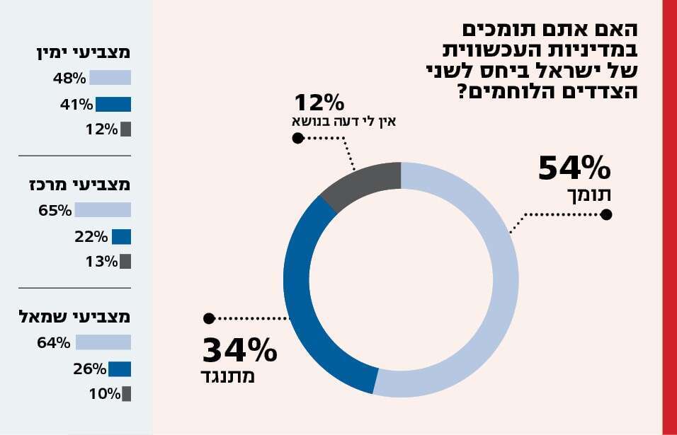 בנוגע להתנהלות המדינית של ממשלת ישראל נוכח המשבר, 54% תומכים בקו שנוקטת הממשלה, שיעור נמוך בהרבה משיעור ההזדהות עם אוקראינה. 34% מהציבור מתנגדים לקו המדיני הנוכחי, ובסוגיה הזו בולט יותר הפער בין תומכי הממשלה למתנגדיה. כאן ברור שהתמיכה בממשלה או ההתנגדות אליה משפיעים על עמדת המשיבים. מתברר שוב שגם סוגיה בינלאומית נבחנת במשקפיים פוליטיים ובהשוואה לממשלת נתניהו הקודמת, וניכרת גם תמיכת הימין בהסדרים בין נתניהו לפוטין בנוגע לפעילות צה"ל נגד גורמי חיזבאללה ואיראן בגבול הצפוני, והרצון להיזהר ולא לפגוע ביחסים הללו.