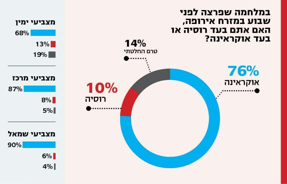 רוב מובהק של 76% מהציבור היהודי בישראל תומך באוקראינה, הצד המותקף, לעומת 10% בלבד התומכים ברוסיה. 14% מתקשים להחליט במי לצדד. בקרב המוסלמים התמיכה ברוסיה מגיעה ל־35% ורק 41% תומכים באוקראינה. מפתיע? לא בטוח.