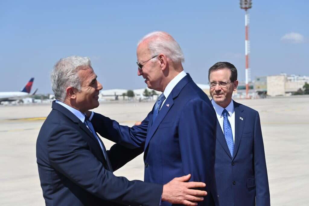 ראש הממשלה יאיר לפיד, הנשיא יצחק הרצוג ונשיא ארצות הברית ג’ו ביידן בטקס קבלת הפנים, בנתב"ג. | צילום: חיים צח, לע"מ