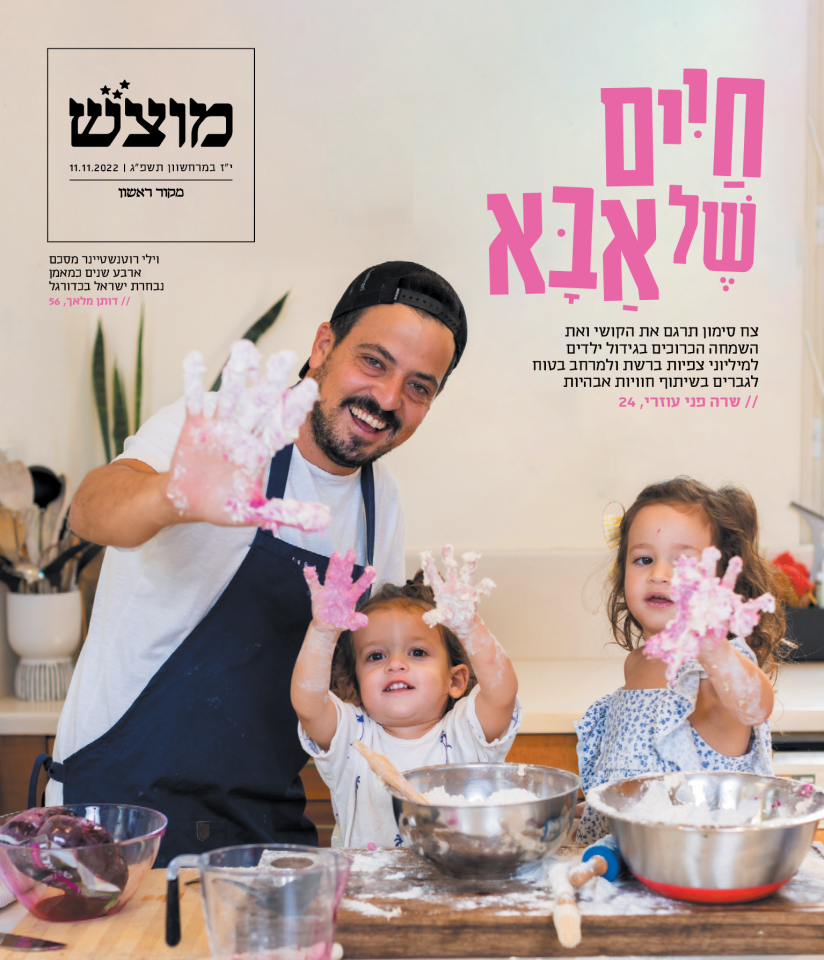 מצלמה, למרבה הפליאה, לא מאוד נוכחת במשפחת סימון. אני מגלה שהטלפון נמצא מולי בלי הרבה גינונים כשהוא שעון על צנצנת מיונז במצב סלפי, והעדשה קולטת את ההתרחשות במטבח של מיה לי (3.5), ים גבריאל (2.3) ואבא שלהם, צח סימון (36). אם השמות האלו לא אומרים לכם כלום מן הסתם הצירופים "אמאל'ה אני אבא" ו"שאמהמה" יעשו את העבודה.