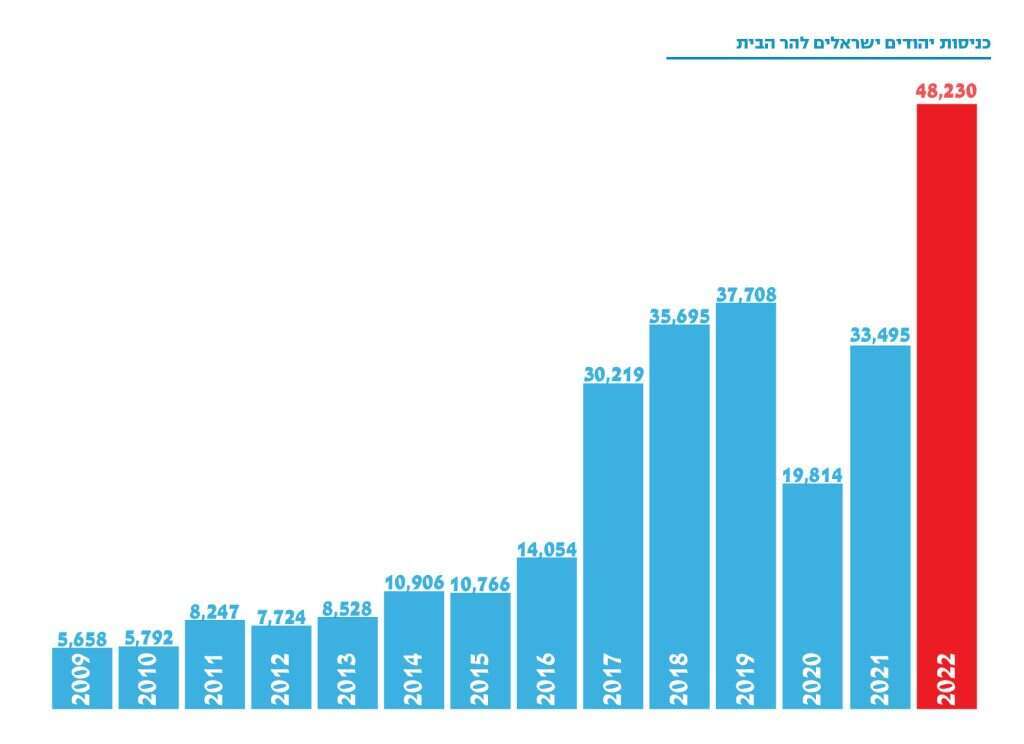 אחרי ירידה במספר העולים בשנתיים שחלפו בשל הגבלות הקורונה והסגרים, מספר היהודים הישראלים העולים להר שב ומטפס. השורה התחתונה: ב־2022 עלו להר הבית כמעט פי תשעה יותר יהודים ישראלים מאשר בשנת 2009 – 48,230 לעומת 5,658, אך פחות תיירים מאשר ב־2009 – 289,604 לעומת 306,947.