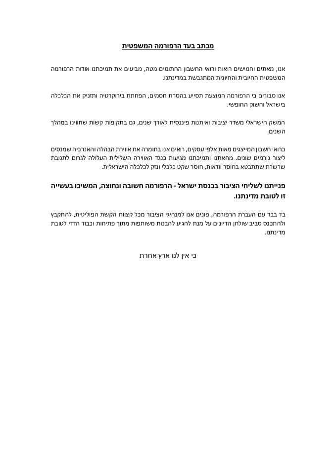 עצומת תמיכה ברפורמה המשפטית: "תזניק את הכלכלה"