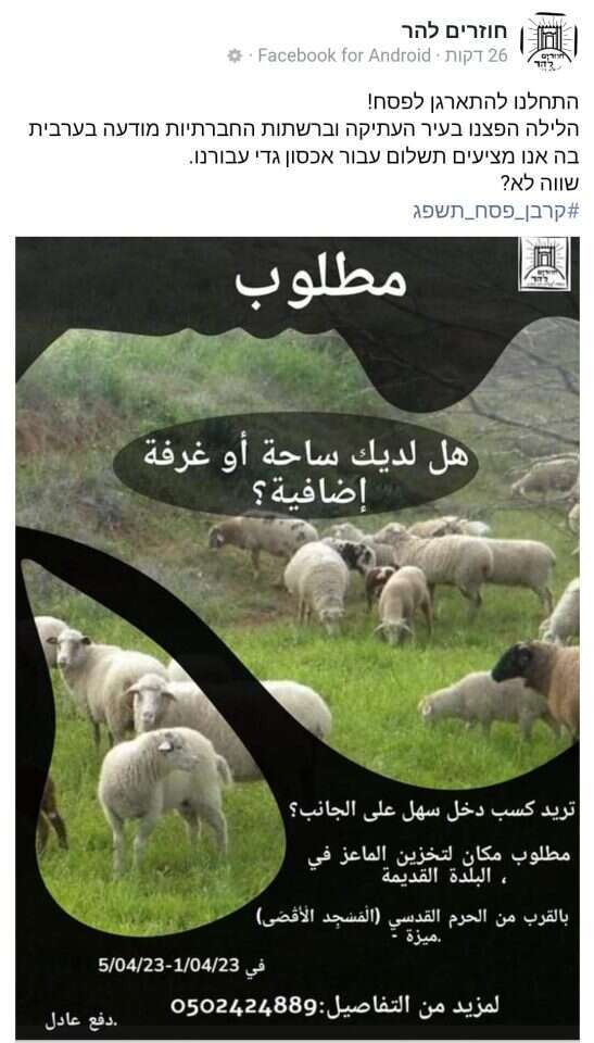 שני פעילי תנועת "חוזרים להר" נעצרו אמש (ג') לאחר שתלו מודעות בערבית המציעות תשלום על אחסון כבשים המיועדים להקרבת קורבן פסח, אירוע שאותו מנסה לקיים התנועה בכל שנה. במהלך היום השניים יובאו לדיון בהארכת מעצרם בפני שופט בבית משפט השלום בירושלים.