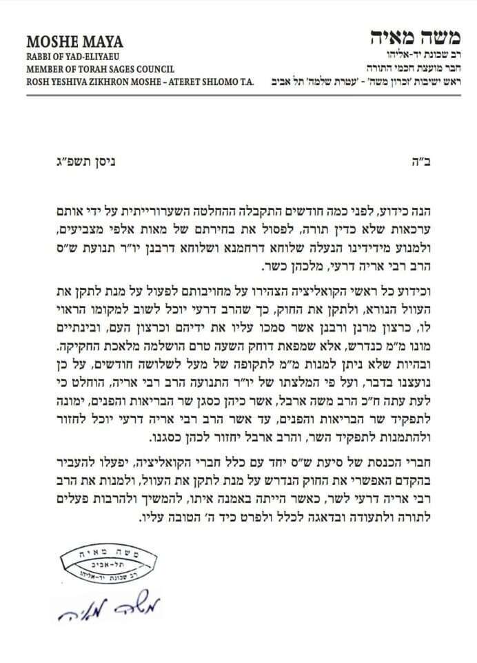 עד כה כיהנו במשרדי הבריאות והפנים השר מיכאל מלכיאלי (בריאות) ויואב בן צור (פנים) כממלאי מקום לתקופה של שלושה חודשים. אלא שמפאת דוחק השעה בטרם הושלמה מלאכת החקיקה, ומאחר שלא ניתן למנות ממלא מקום לתקופה של מעל לשלושה חודשים, נכתב במכתב של הרב מאיה כי "על כן נועצנו בדבר, ועל פי המלצתו של יו"ר התנועה הרב רבי אריה, הוחלט כי לעת עתה ח"כ הרב משה ארבל, אשר כיהן כסגן שר הבריאות והפנים, ימונה לתפקיד שר הבריאות והפנים, עד אשר הרב רבי אריה דרעי יוכל לחזור ולהתמנות לתפקיד השר, והרב ארבל יחזור לכהן כסגנו".