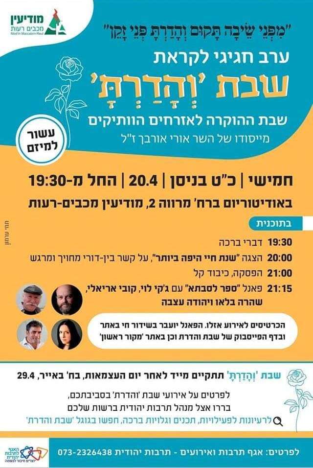 לקראת שבת "והדרת", שתצוין לאחר יום העצמאות, יתקיים במודיעין ערב חגיגי שיעסוק בקשר הבין-דורי. פאנל מיוחד שייערך בערב זה יועבר בשידור חי באתר מקור ראשון