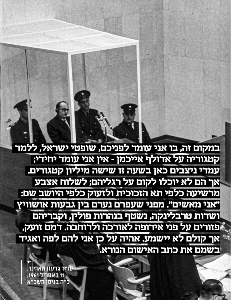44. תמי האוזנר-רוה | "במקום זה, בו אני עומד לפניכם, שופטי ישראל, ללמד קטגוריה על אדולף אייכמן - אין אני עומד יחידי; עמדי ניצבים כאן בשעה זו שישה מיליון קטגורים. אך הם לא יוכלו לקום על רגליהם; לשלוח אצבע מרשיעה כלפי תא הזכוכית ולזעוק כלפי היושב שם: "אני מאשים". מפני שעפרם נערם בין גבעות אושוויץ ושדות טרבלינקה, נשטף בנהרות פולין, וקבריהם פזורים על פני אירופה לאורכה ולרוחבה. דמם זועק, אך קולם לא יישמע. אהיה על כן אני להם לפה ואגיד בשמם את כתב האישום הנורא" - עו"ד גדעון האוזנר, 11 באפריל 1961, כ"ה בניסן תשכ"א.