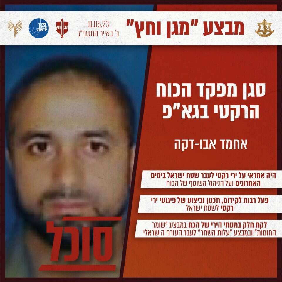 בעוד ישראל והג'יהאד האסלאמי מקיימים שיחות להפסקת אש באמצעות המצרים, הירי הרקטי נמשך והוא מגיע גם עד ערי המרכז, במקביל, צה"ל ממשיך לחסל את בכירי הג'יהאד. בפעילות משותפת של צה"ל ושב"כ חוסל סגן מפקד הכוח הרקטי בארגון הטרור הג'יהאד האסלאמי הפלסטיני ברצועת עזה, אשר לקח חלק משמעותי בפיקוד ובביצוע מטחי הירי לעבר ישראל. גורם צבאי מסר כי "אבו דקה הוא סגנו של עלי ע'אלי, מפקד הכוח הרקטי של הגא"פ אשר סוכל לפנות בוקר בתקיפת צה"ל ושב"כ בחאן יונס"