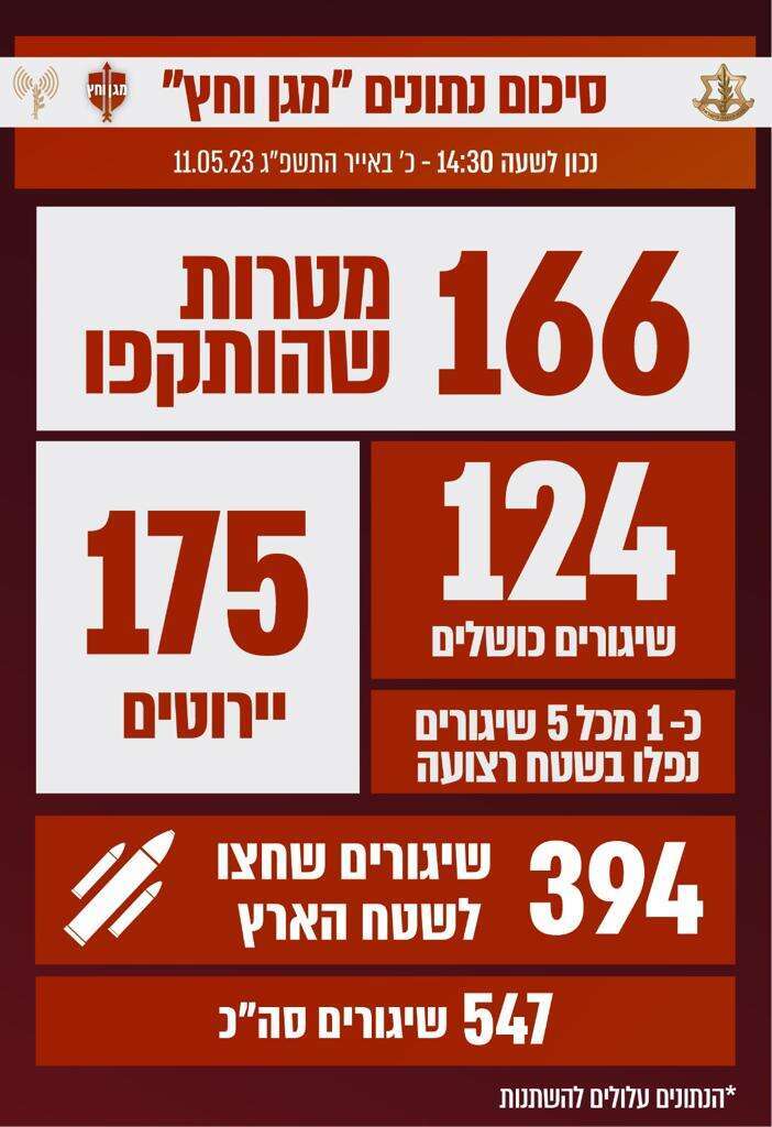 עד שעה זו צה"ל תקף 166 מטרות, והגא"פ שיגרו 547 רקטות מהן 394 עברו לשטח ישראל והשאר נפלו בשטח הרצועה כ-124 רקטות. כיפת ברזל וקלע דויד ירטו 175 רקטות.